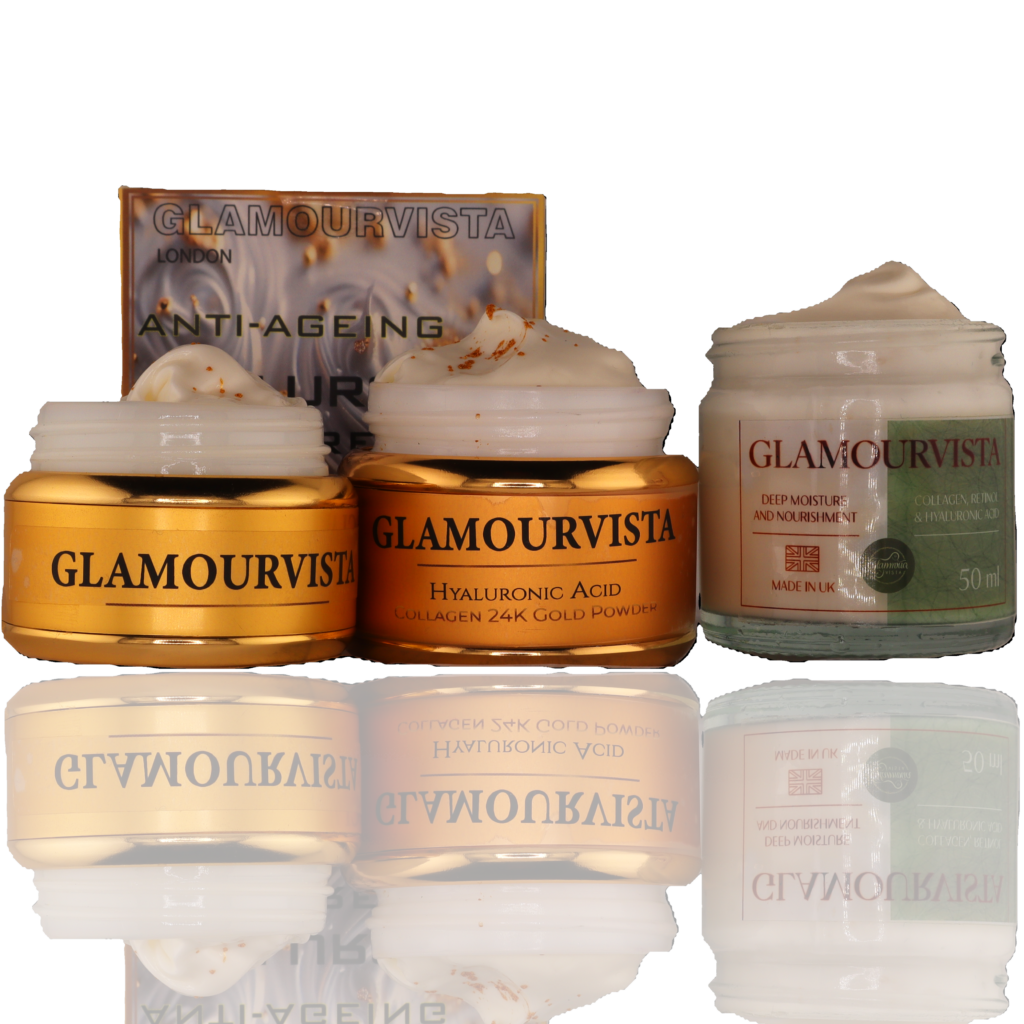 Glamourvista’s signature moisturizer is a powerhouse of anti-ageing ingredients, combining argan oil, jojoba oil, collagen, hyaluronic acid, and retinol. Each ingredient has been meticulously chosen to deliver unparalleled results: